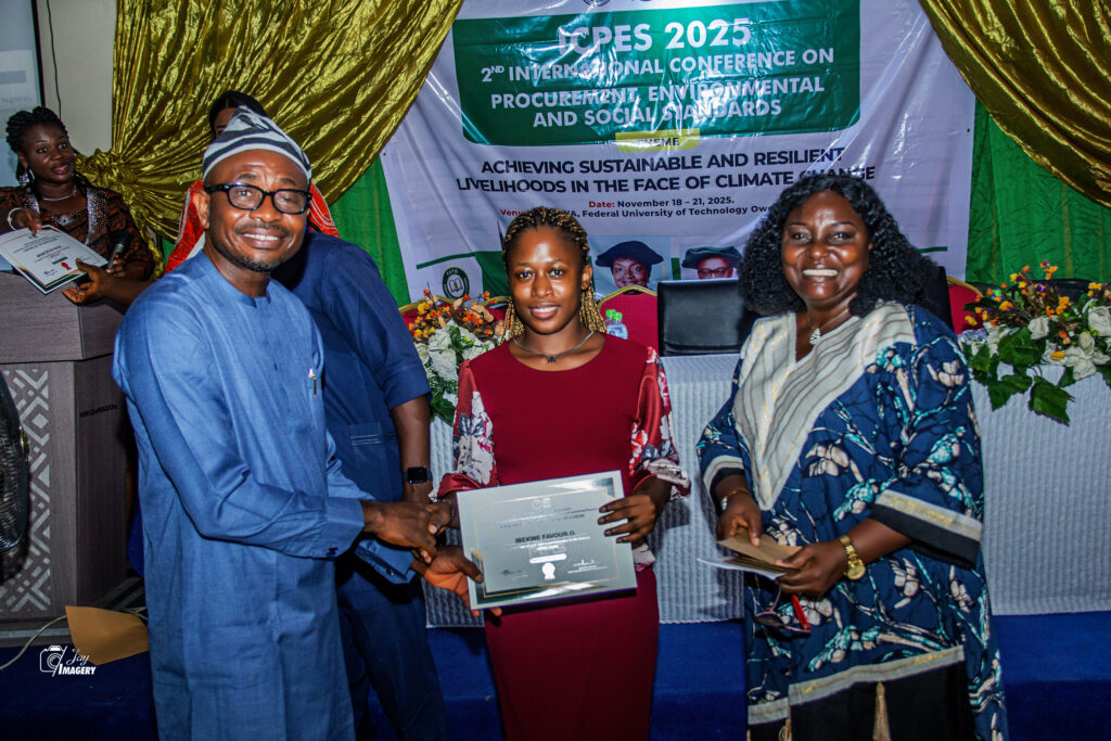 Held in November 2025, at the FUTOWA complex, the conference brought together academics, government officials, practitioners, industry experts, students, and development stakeholders to explore how policy, procurement, and environmental governance can support more resilient and sustainable livelihoods. The event opened with an engaging student debate between participants from the School of Environmental Sciences (SOES) and CE-sPESS. Ten topics linked to the theme of the conference were contested, with Ibekwe Favour, a first-year student in the Procurement Unit, emerging as the overall winner for her articulate argument against the motion “sustainable procurement should be mandatory for all public institutions, regardless of cost”.